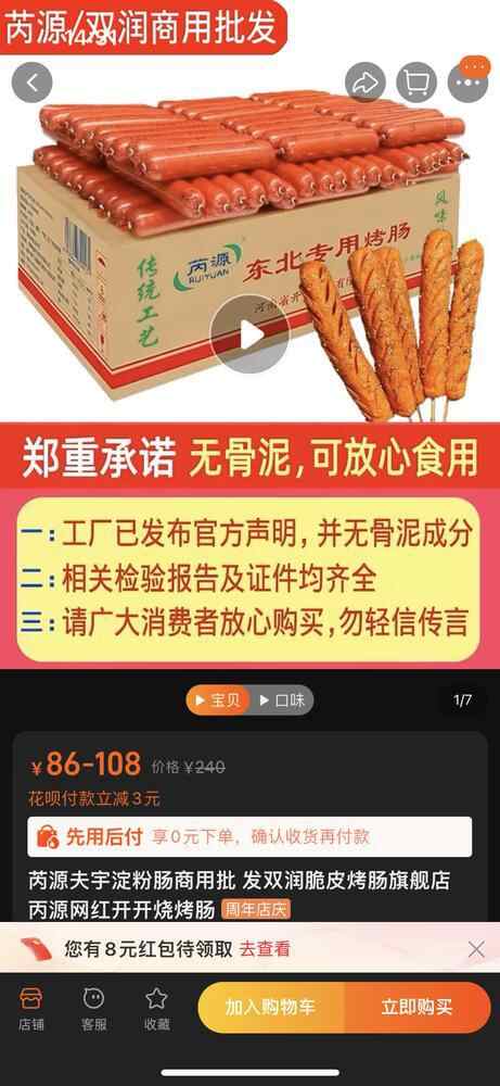 与此同时,在电商平台上,不少淀粉肠商家已在封面图片上用显眼文字注明“承诺无骨泥”“未添加骨泥”等。