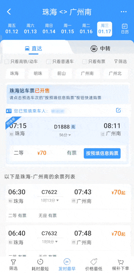 填写完毕后,再次进入车次选择界面,可以看到余票列表顶部展示了预选车次以及最近起售时间。时间一到,待“按预填信息购票”按钮由灰转蓝时,可点击按钮,一键快速下单。