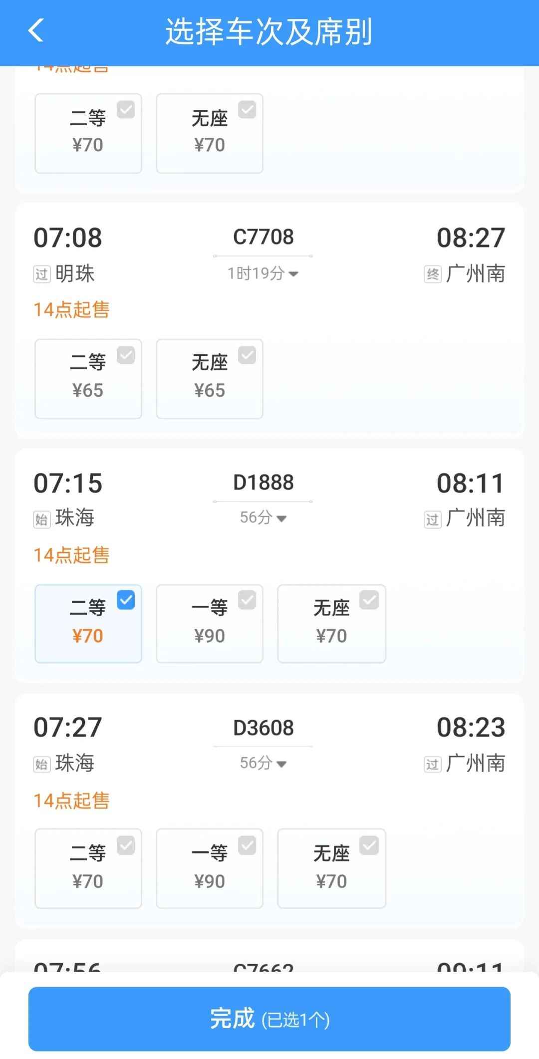 根据需求,选择预购买的车次及席别,可同时勾选多个。注意,此处仅显示未到起售时间的车次,已起售的车次您可直接购票。