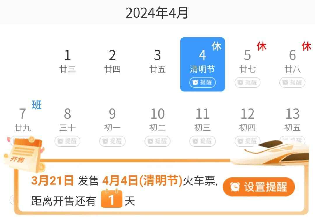 根据国务院办公厅关于2024年部分节假日安排的通知,2024年4月4日至6日放假调休。铁路部门将于明日(3月21日)发售清明假期第一天的火车票。