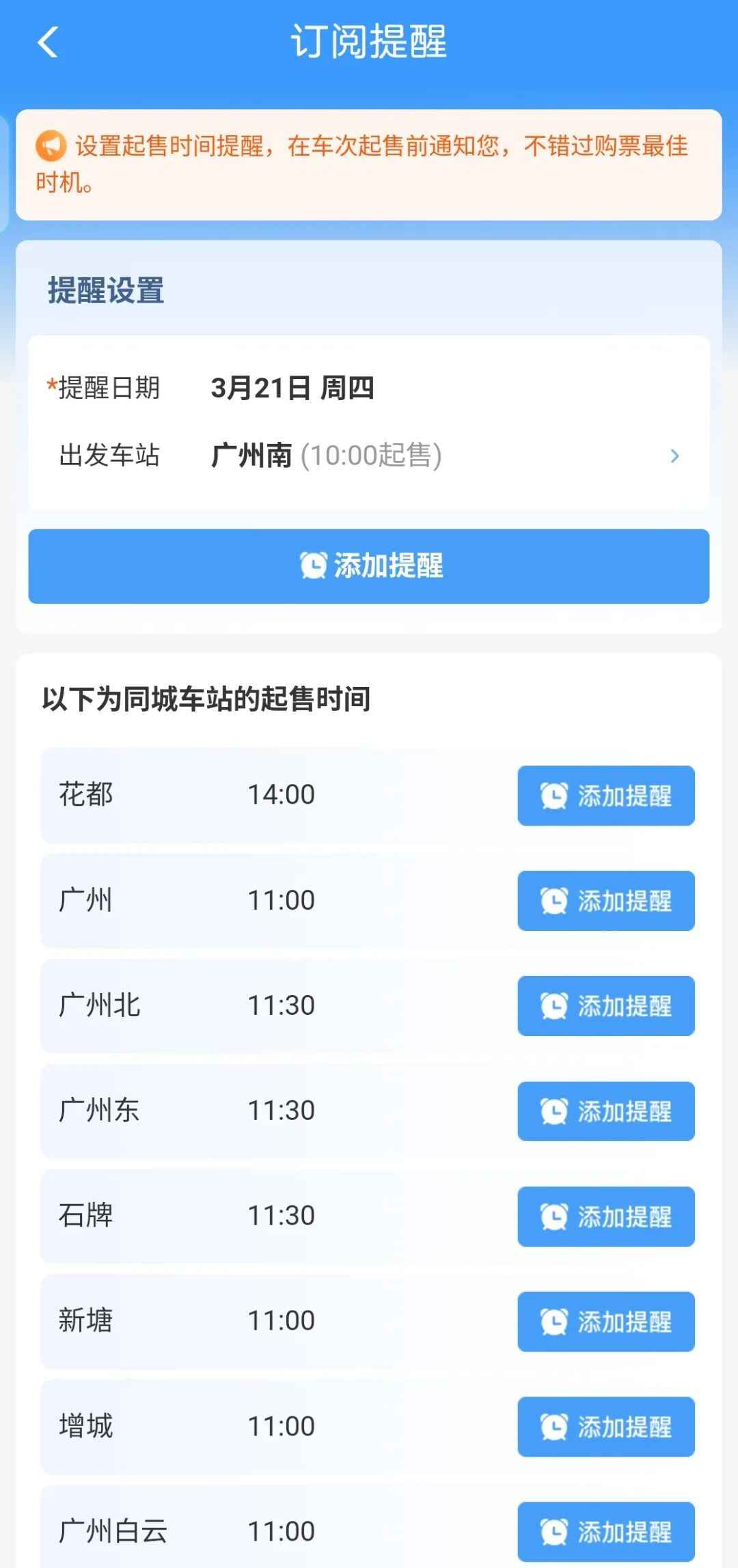 可根据需要选择其他同城车站,时间各有不同哦!点击“添加提醒”。