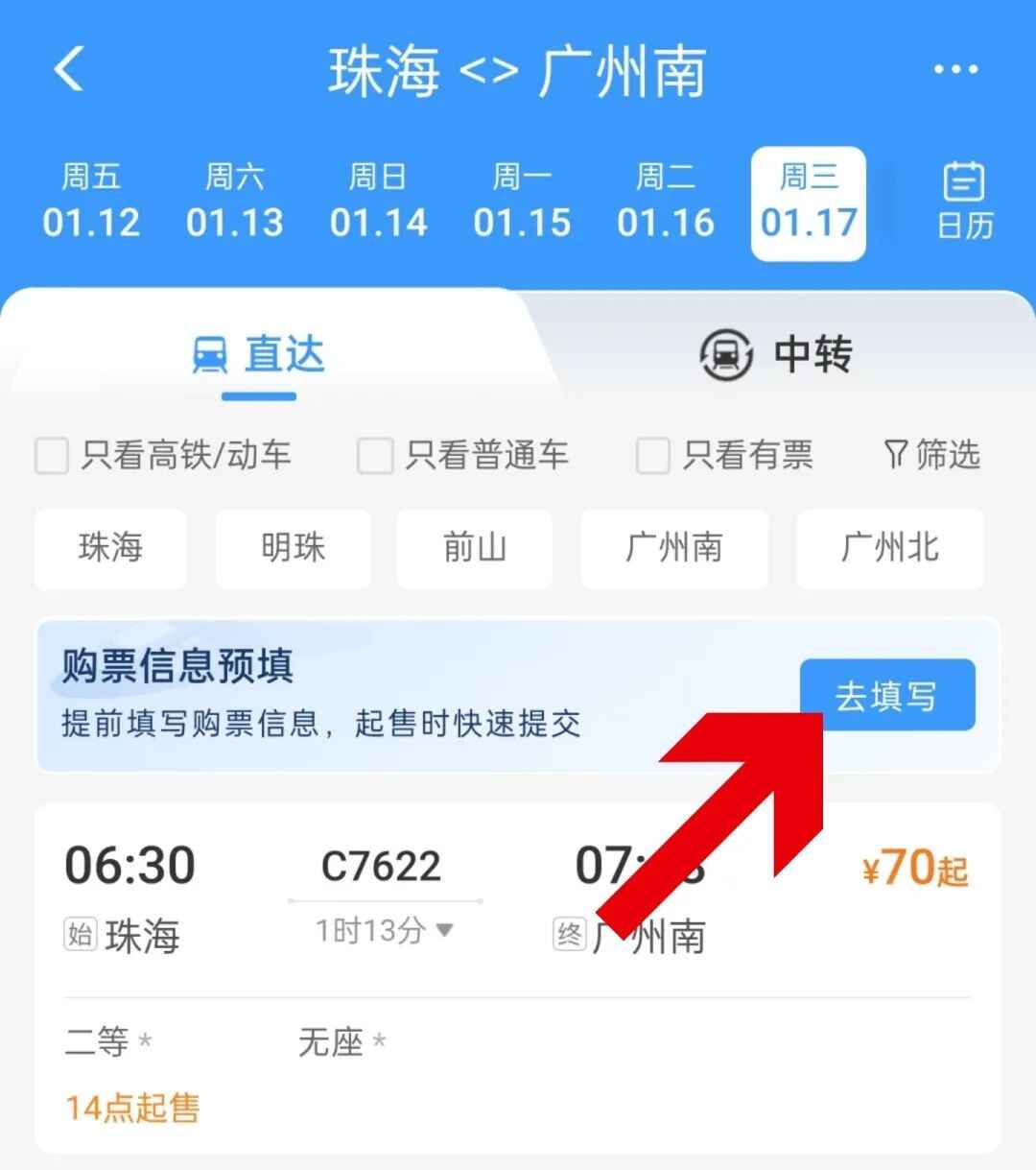 点击顶部“购票信息预填”横幅中的“去填写”按钮。
