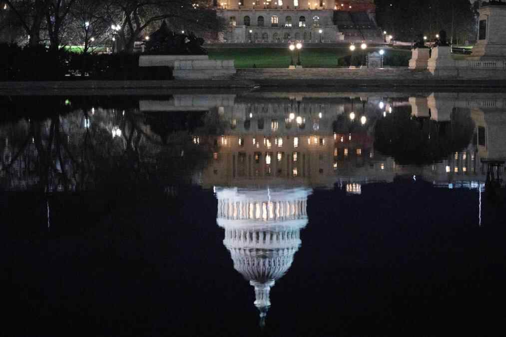这是2月13日在美国首都华盛顿拍摄的国会大厦水中倒影。新华社记者刘杰摄