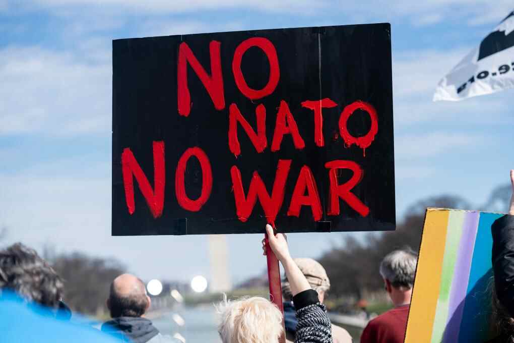 2023年2月19日,在美国首都华盛顿,一名抗议者手举标语在林肯纪念堂前参加集会。“不要更多战争!不要更多战争!不要更多战争!”美国上千名反战人士当日下午在林肯纪念堂前举行集会,齐声高喊。新华社记者刘杰摄