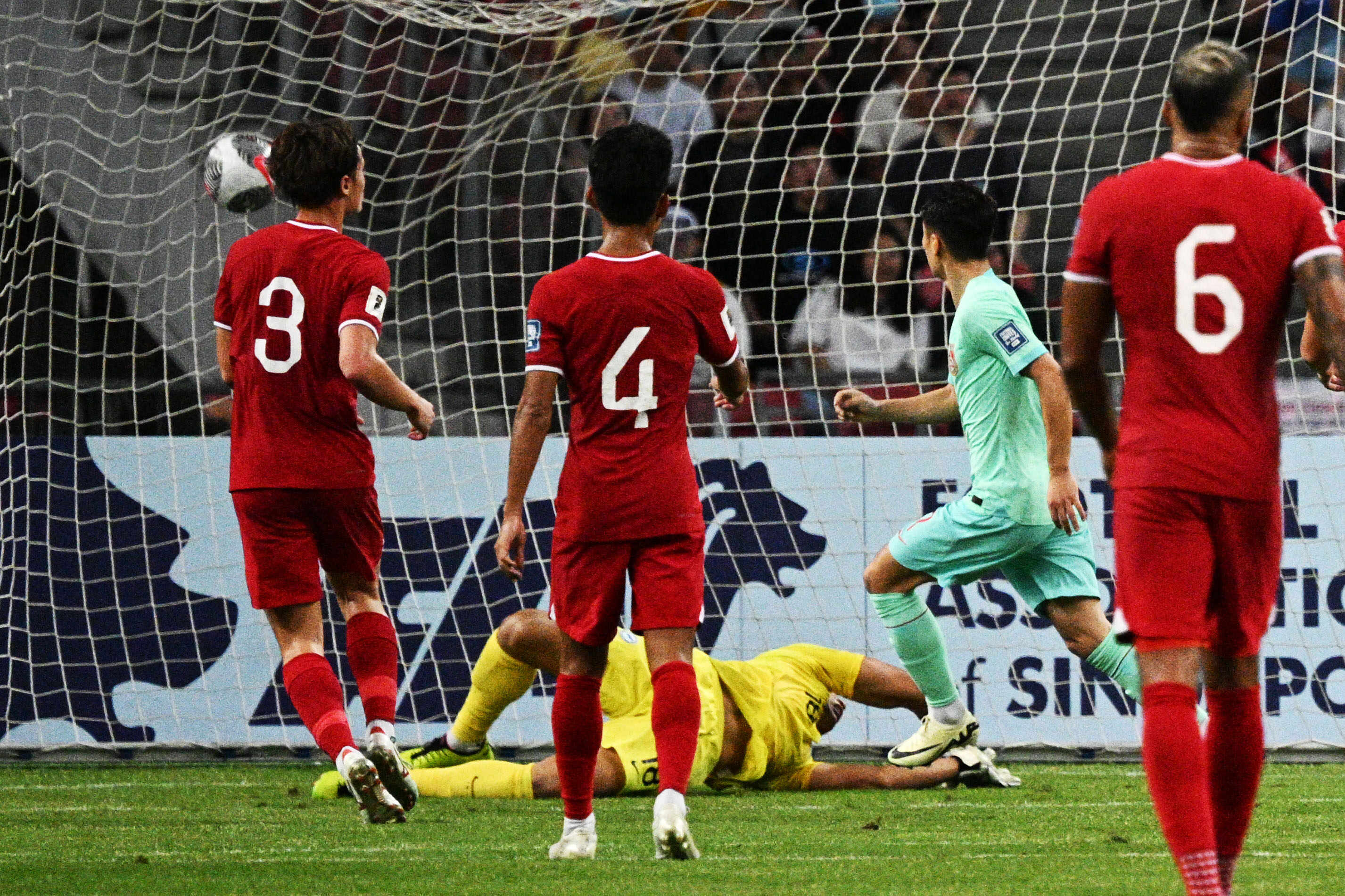 下半场,一次意外的丢球让比赛重新恢复悬念。第53分钟,新加坡后场一脚威胁不大的长传球,替补出场的前锋拉姆利在张琳芃、朱辰杰、蒋光太三名后卫包夹的情况下选择直接打门,皮球碰到防守球员的腿部变线后诡异地滚入球门。