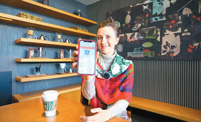 一名外籍人士在北京望京一家咖啡店内体验使用手机小程序预定公园门票。康 杰摄
