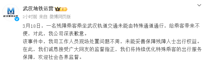 3月18日,一名残障乘客乘坐武汉轨道交通未能由特殊通道通行,给乘客带来不便,对此,我公司深表歉意。