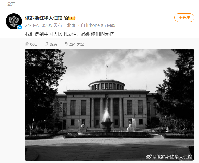 3月23日9时05分,俄罗斯驻华大使馆发布微博:我们得到中国人民的哀悼,感谢你们的支持。