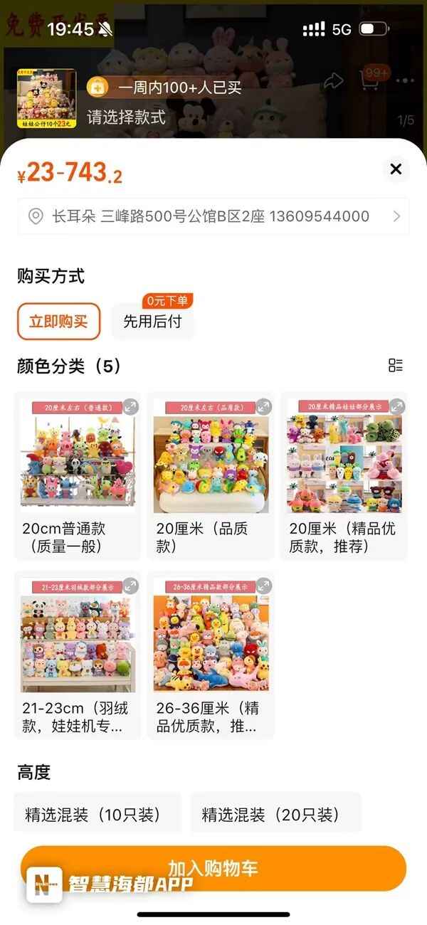 同样,记者还发现部分网店商家在出售玩偶时特意对商品的质量做了区分。如一家名为“聚美毛绒玩具商行”的玩偶供应商,在店铺内将同为20cm高的娃娃分为了羽绒款、精品款、品质款、普通款等四类,价格从2.3元到7.46元不等。
