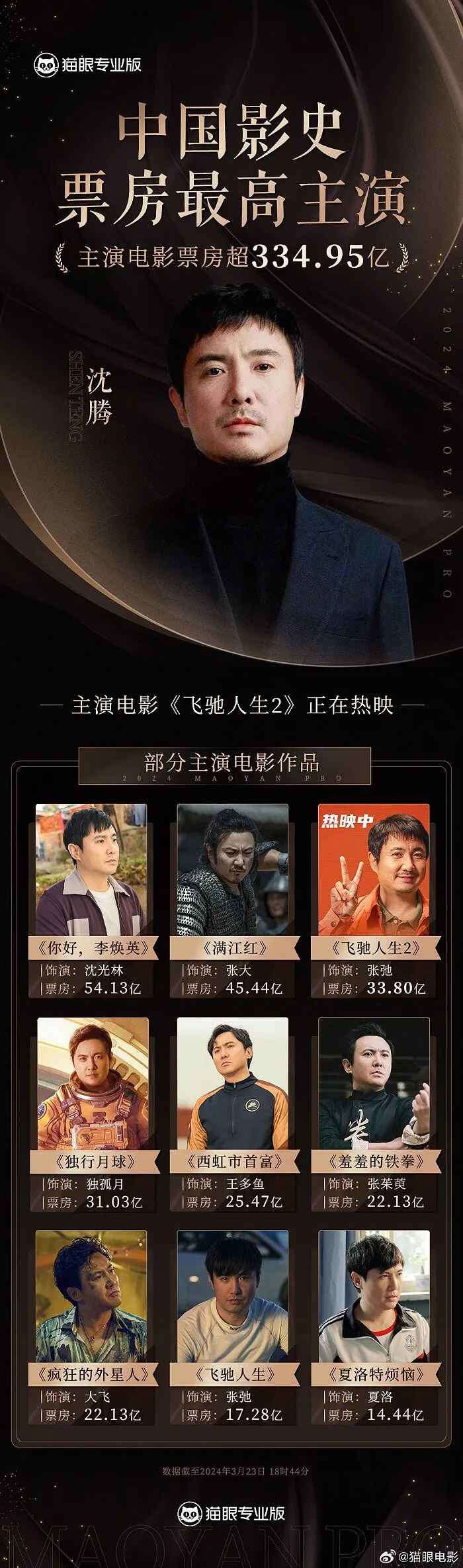 据灯塔专业版微博3月23日消息,电影《飞驰人生2》正在热映,助力演员沈腾主演电影票房超334.99亿元,成为中国影史主演电影票房最高男演员!另据猫眼电影,沈腾也同时成为中国影史票房最高主演。