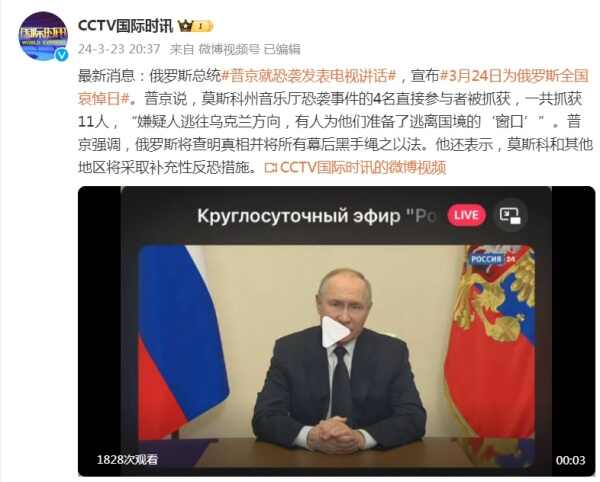 最新消息:俄罗斯总统普京就恐袭发表电视讲话,宣布3月24日为俄罗斯全国哀悼日。普京说,莫斯科州音乐厅恐袭事件的4名直接参与者被抓获,一共抓获11人,“嫌疑人逃往乌克兰方向,有人为他们准备了逃离国境的‘窗口’”。