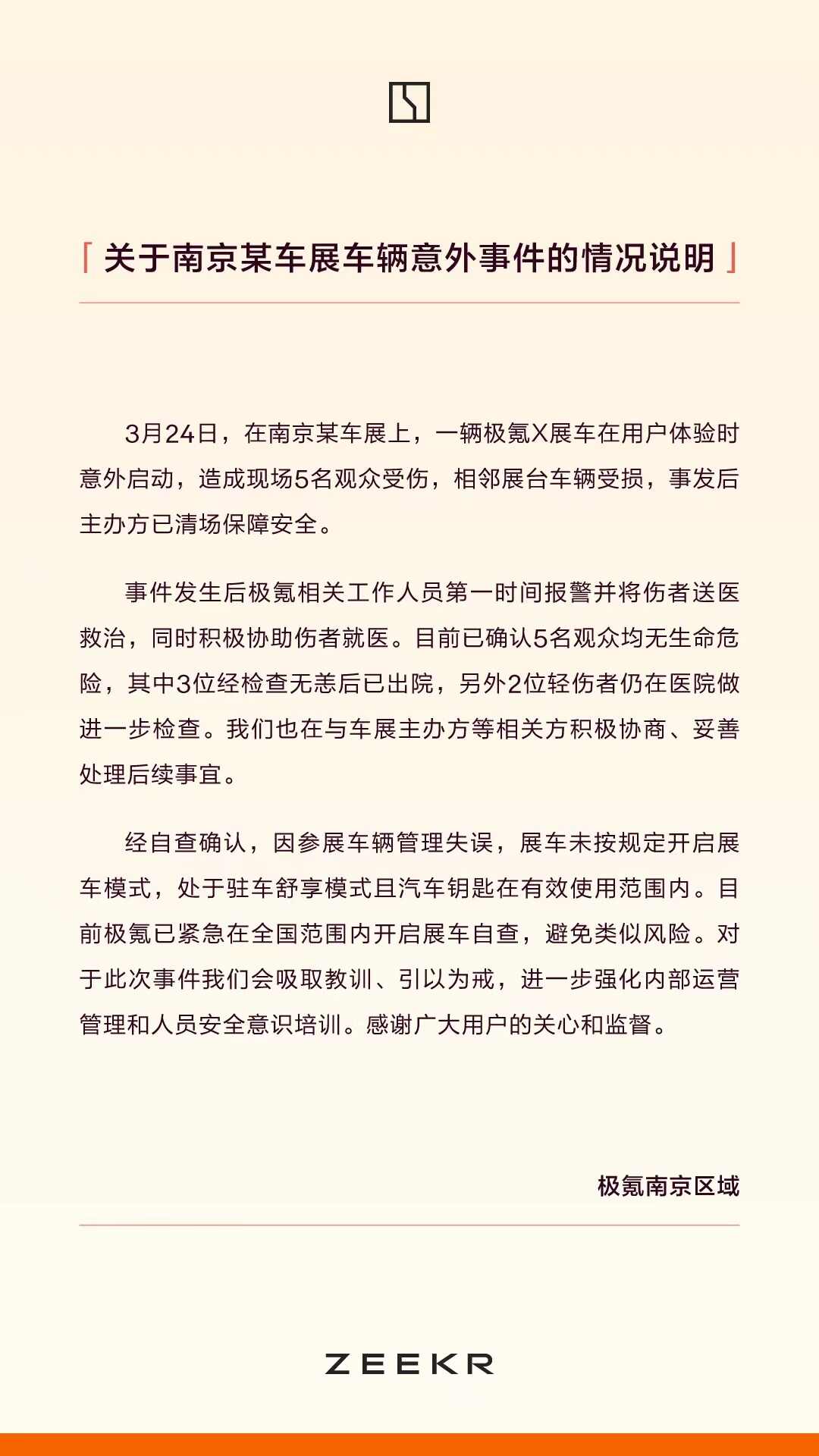 3月24日,在南京某车展上,一辆极氪X展车在用户体验时意外启动,造成现场5名观众受伤,相邻展台车辆受损,事发后主办方已清场保障安全。