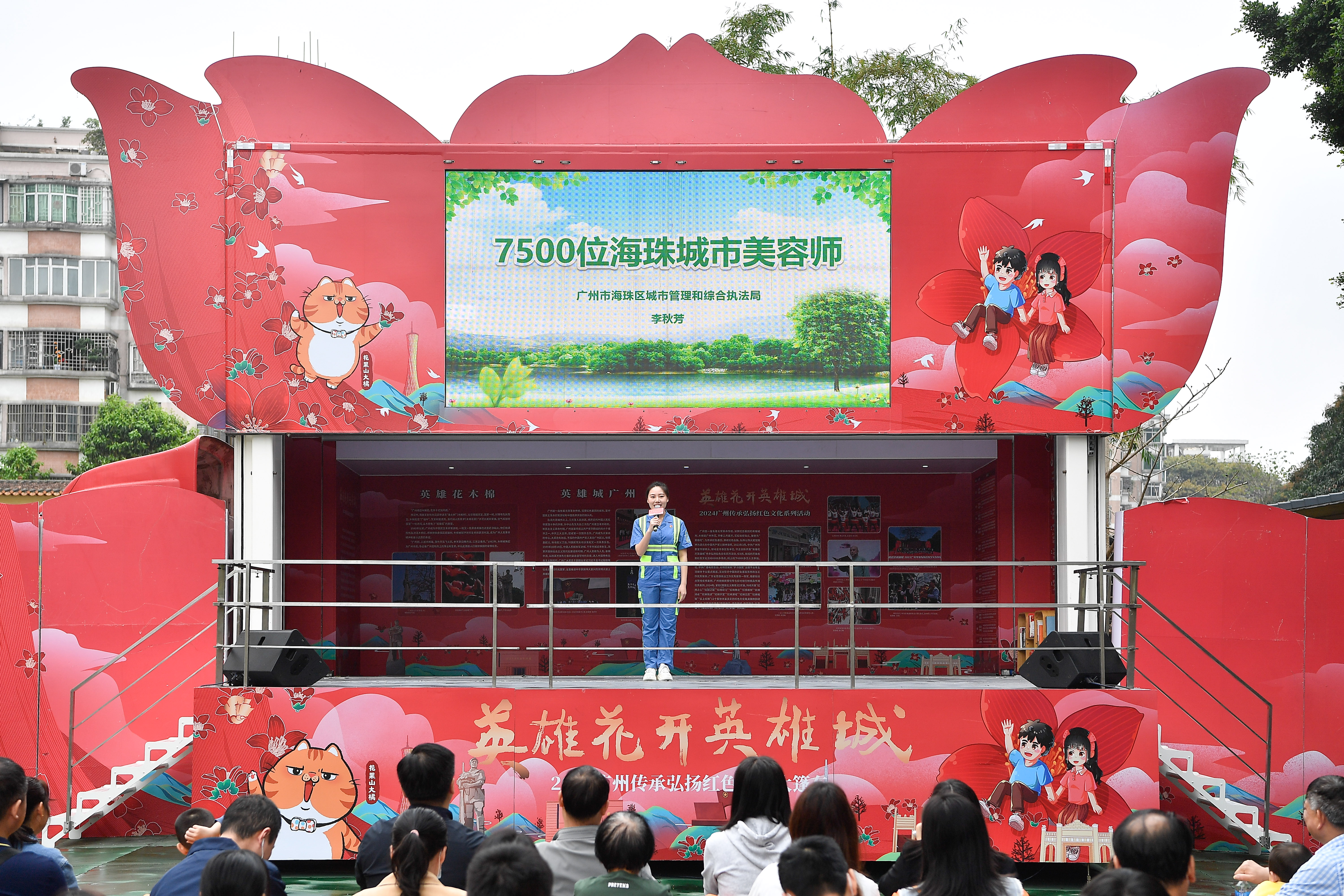 现场还举行了“英雄花开英雄城”2024广州传承弘扬红色文化大篷车旗帜传递交接仪式。在现场观众的注目下,鲜红的大篷车旗帜交接到了海珠区代表手中。据悉,该旗帜跟随大篷车在广州11区传递,寓意传承红色基因、传递红色力量,红色文化系列宣传活动在广州次第花开。