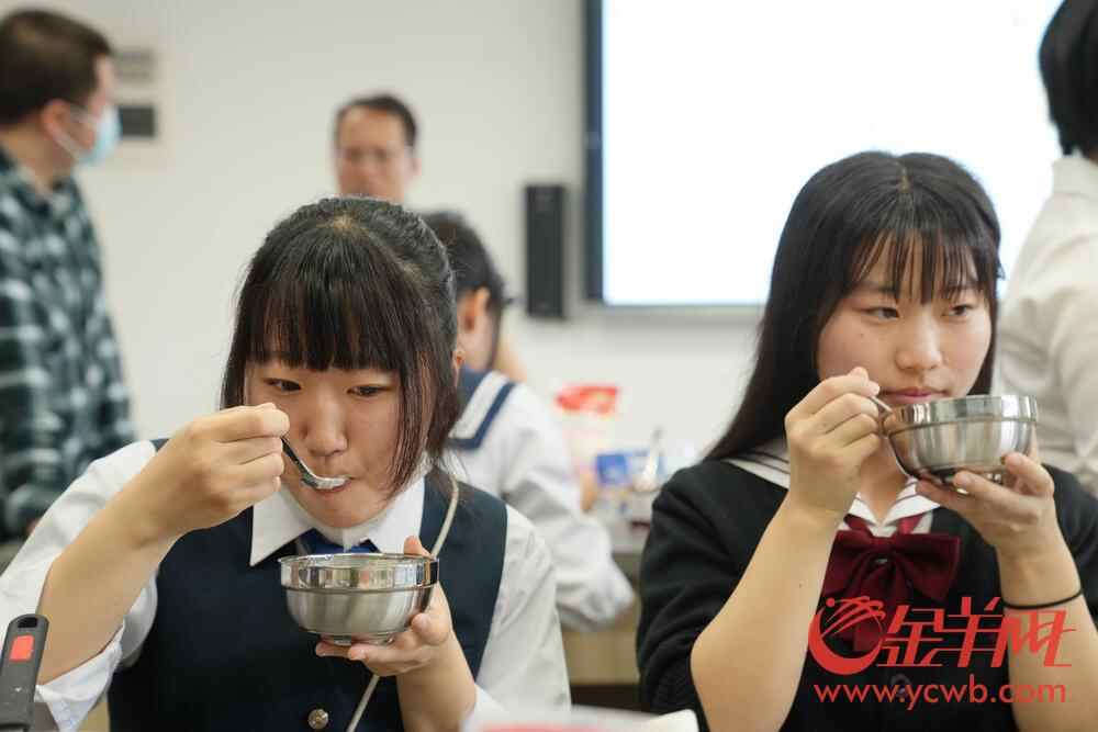 日本爱知县的青少年学生在广东实验中学上劳动课,体验制作广东传统美食姜撞奶。图为日本学生品尝自制的姜撞奶。