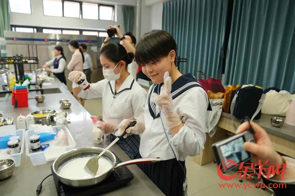 日本爱知县的青少年学生在广东实验中学上劳动课,体验制作广东传统美食姜撞奶。