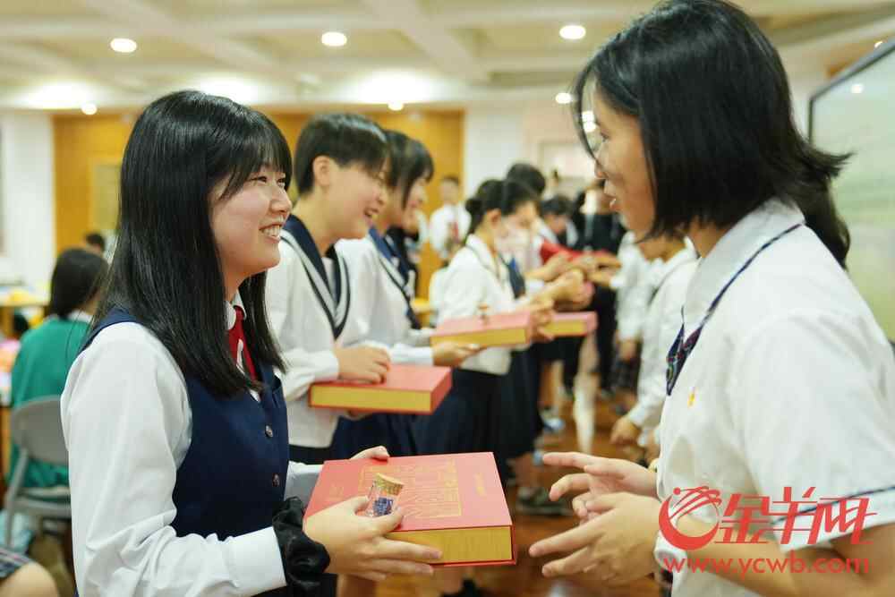 日本爱知县的青少年学生与广东实验中学的学生互赠礼物。