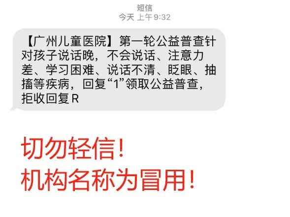 近期,有社会医疗机构冒用广州市妇女儿童医疗中心(以下简称“广州妇儿中心”)名称,通过群发短信的方式,广泛宣传该中心正在进行“身高普查”“针对孩子说话晚,不会说话、注意力差等”等公益普查项目。