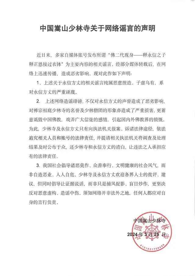 3月26日,少林寺官方发布《中国嵩山少林寺关于网络谣言的声明》,该声明表示,多家自媒体账号发布所谓“佛二代现身——释永信之子释正恩接过衣钵”等相关内容,纯属恶意捏造、子虚乌有。