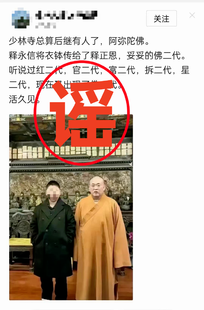 连日来,多个自媒体账号发布所谓“佛二代现身——释永信之子释正恩接过衣钵”为主要内容的相关谣言,在网络上迅速传播,造成恶劣影响。