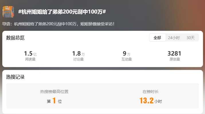 3月26日,话题#杭州姐姐给了弟弟200元刮中100万#登顶微博热搜,引发网友广泛关注和热议。