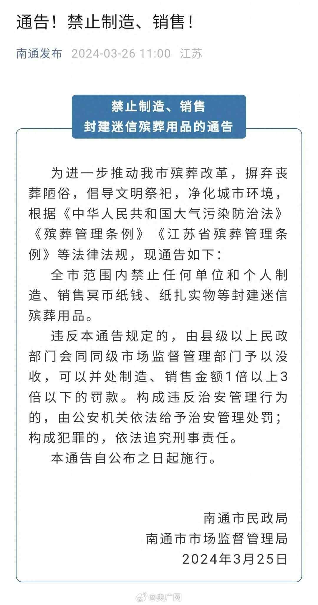 3月26日,江苏省南通市发布《禁止制造、销售封建迷信殡葬用品的通告》,要求全市范围内禁止任何单位和个人制造、销售冥币纸钱、纸扎实物等封建迷信殡葬用品。违反本通告规定的,由县级以上民政部门会同同级市场监督管理部门予以没收,可以并处制造、销售金额1倍以上3倍以下的罚款。