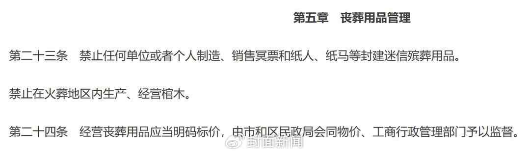 比如,在《北京市殡葬管理条例》中第二十三条就有规定,禁止任何单位或者个人制造、销售冥票和纸人纸马等封建迷信殡葬用品,制造、销售封建迷信殡葬用品的,由民政部门会同工商行政管理部门予以没收,可以并处制造、销售金额1倍以上3倍以下的罚款。