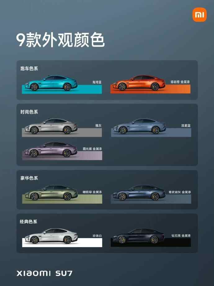 雷军称,全系小米SU7共有4大色系,9种颜色,其中跑车色系:海湾蓝 、熔岩橙;时尚色系:雅灰 、流星蓝、霞光紫;豪华色系:橄榄绿、寒武岩灰;经典色系:珍珠白、钻石黑。另有4款内饰、4套轮毂轮胎可供选择。此外,雷军发布了两款“汽车周边”产品——全景天幕遮阳帘和米家前风挡遮阳伞。
