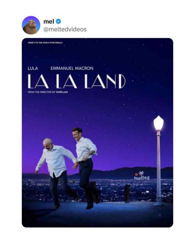 面对网友的幽默热议,北京时间29日,马克龙在社交媒体X上发文回应,甚至附带了一张网友调侃他与卢拉照片的截图,图片以电影《爱乐之城》海报为基础,上面是马克龙在访问巴西期间与卢拉的互动照片。