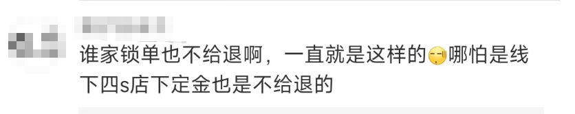 在网上投诉的用户看来,他们“意外”提前锁单,也没有二次提示,导致无法退定金。不过,也有网友调侃称,这批想退定金的用户,并非有真实购车意图,或只是为了一个订单截图发社交媒体而已。