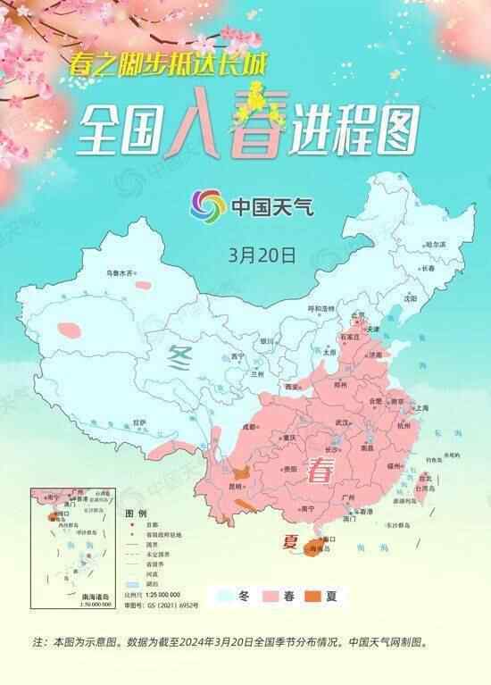从最新全国入春进程图来看,截至3月20日,春季的版图已十分可观,几乎与冬季持平,春季最前沿已经抵达长城脚下。除了南方大部,京津冀、河南、山东、陕西南部等地也已纳入春的怀抱。