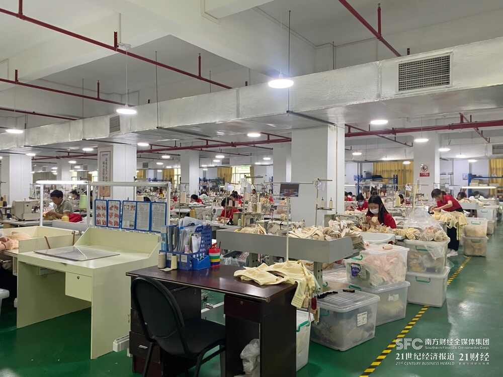 3月27日,南方财经全媒体记者走进位于汕头市潮阳区的华美工厂,工厂的每层楼对应的是不同制造工序车间。一根纱线经过织造成布,再印染花纹,使用辅料加工,最后成品在一楼仓库打包装箱,销往全国各地。