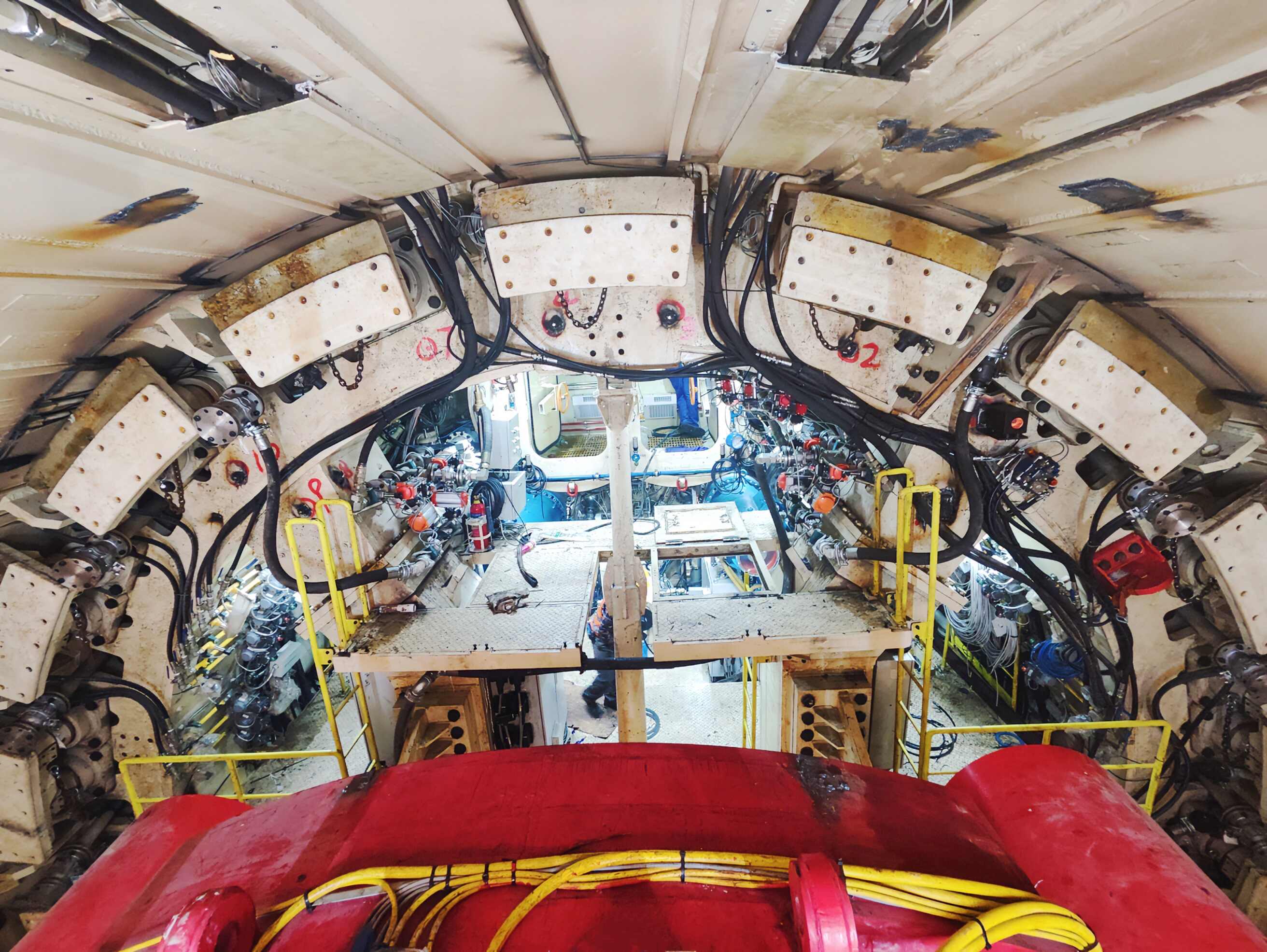 为攻克地质风险,广州地铁联合总承包单位中建股份和施工单位中建三局,对盾构机选型进行针对性设计,采用直排式带螺机泥水盾构机“中建芳白11号”。盾构整机全长142米,开挖直径8.84米,整套机组约1200吨。盾构机强化了逆循环功能,并配备采石箱,更易排出泥水舱内渣土,防止泥饼与滞排现象。同时,盾构机还优化刀盘及刀具配置,配置大开口率刀盘,刀具采用滚、刮刀分离布置形式,同时增加径向重型撕裂刀,可有效防止上软下硬地层中盾构机上漂的问题。滚刀还配置温度和旋转检测功能,可实时监测掌子面异常情况。