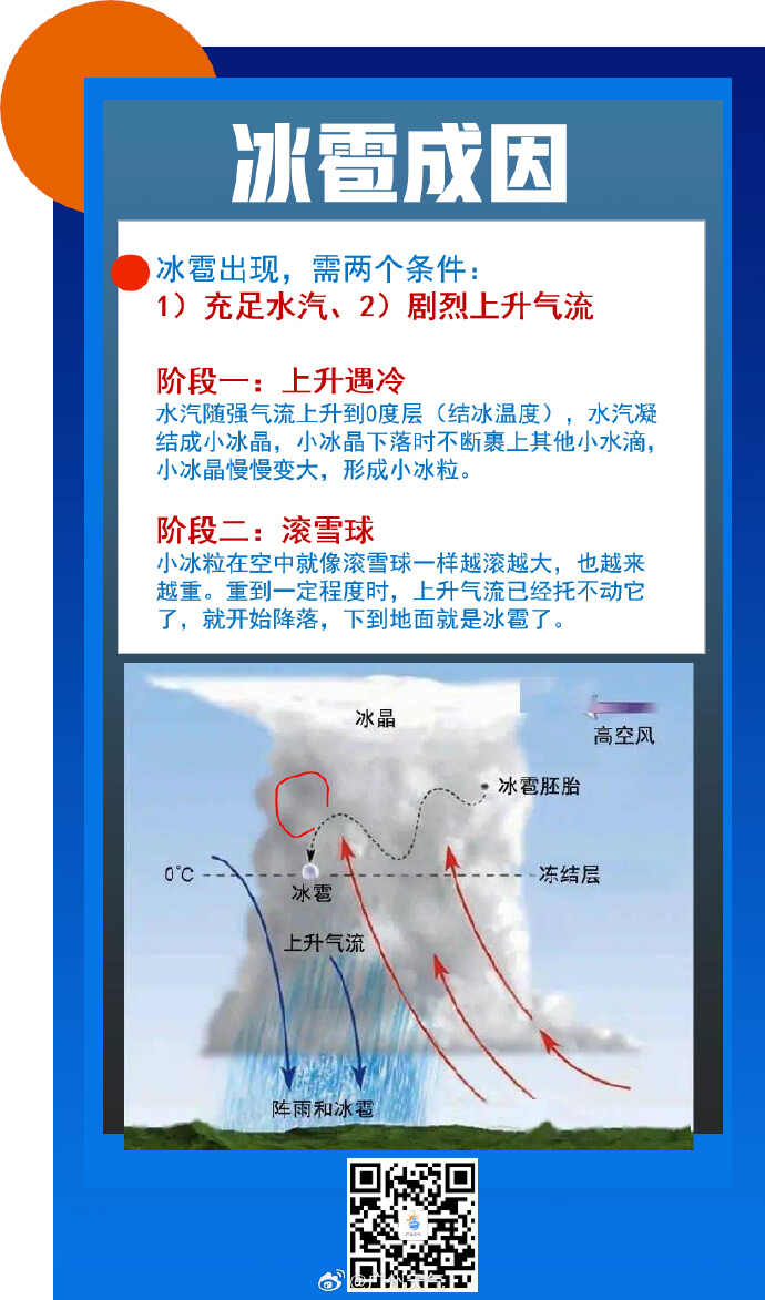 在这个过程中,水汽随强气流上升到0度层(结冰温度),水汽就凝结成小冰晶,也就是冰雹核,并通过滚雪球效应形成冰雹。