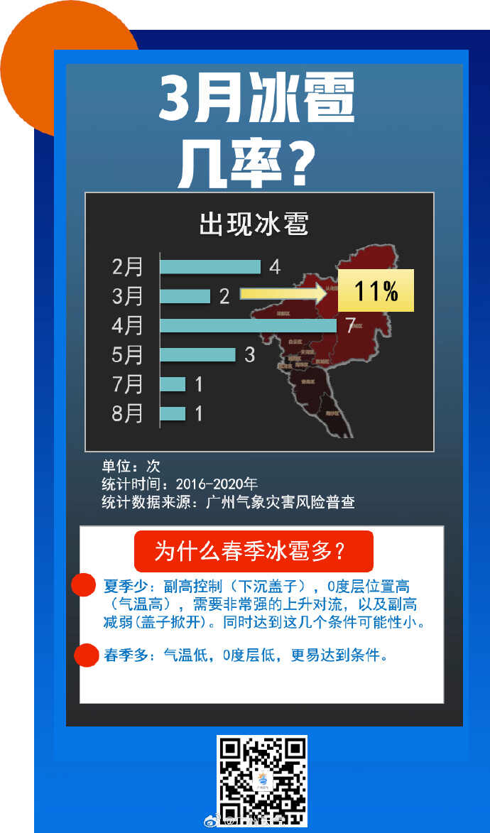 据历史资料统计,广州冰雹主要出现在2-10月,尤其集中在3-5月,频次高发区为北部地区,3月的出现的几率大概为11%。