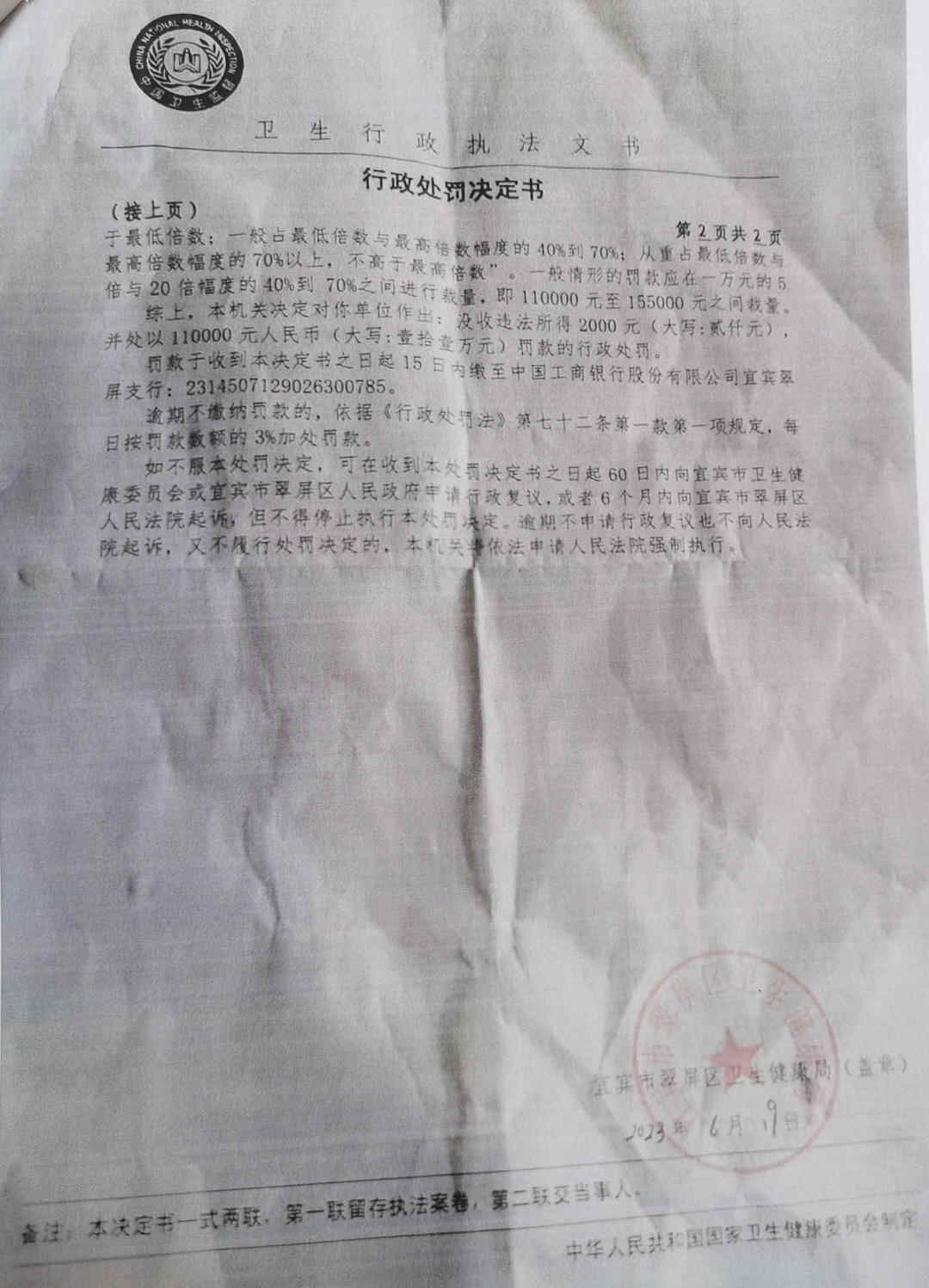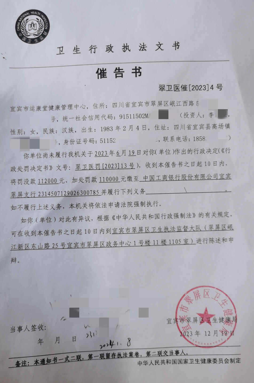 但李女士既未按期缴纳罚款,也未申请行政复议或起诉。2023年12月19日,翠屏区卫健局发出《催告书》,除催缴此前的11.2万元罚没款外,加处罚款11万元,理由是运康堂未履行此前的处罚决定。