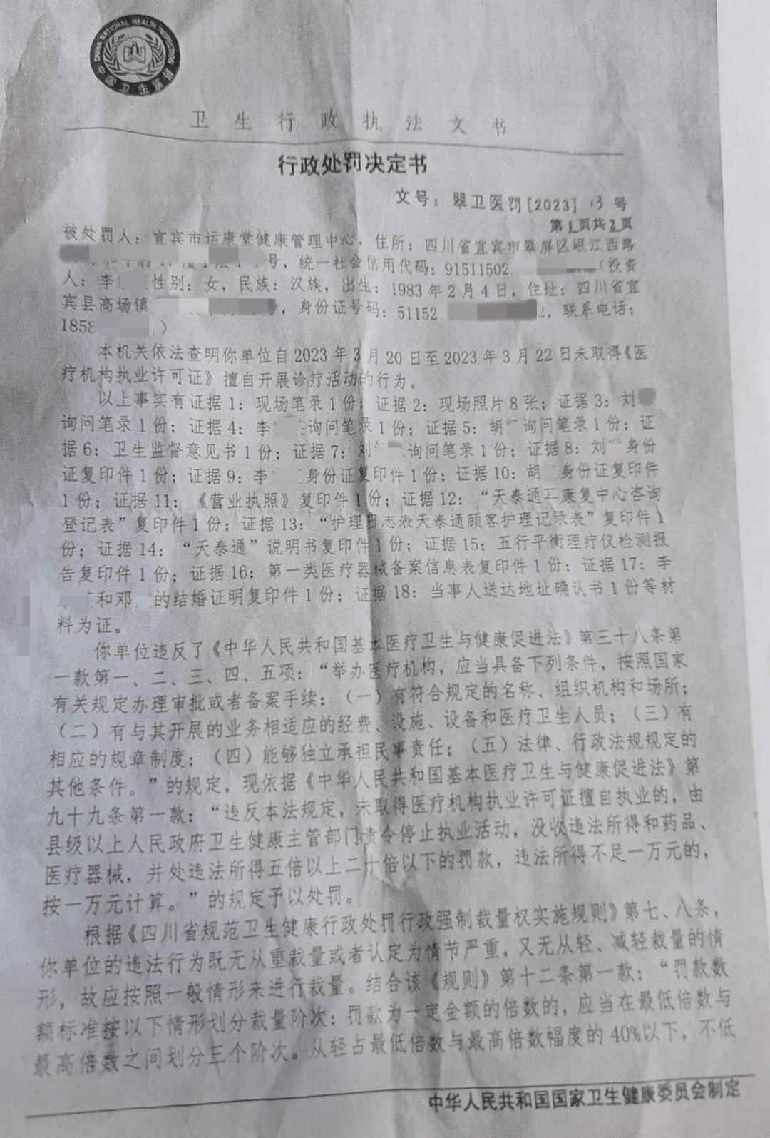 2023年6月19日,翠屏区卫健局作出行政处罚决定,认定运康堂自2023年3月20日至3月22日未取得《医疗机构执业许可证》擅自开展诊疗活动,并对运康堂处以没收违法所得2000元、罚款11万元的行政处罚。