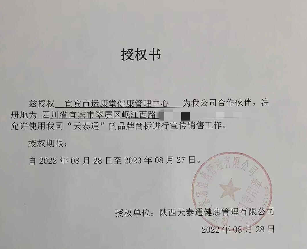 但目前她无法提供加盟协议,《授权书》显示,2022年8月28日,陕西天泰通健康管理有限公司授权宜宾市运康堂健康管理中心(以下简称运康堂)为公司合作伙伴,允许其使用公司“天泰通”品牌商标进行宣传销售,期限一年。