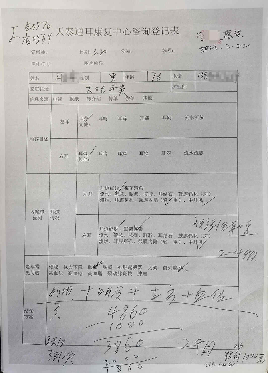 李女士的丈夫胡某负责接待顾客,利用小可视设备等检查顾客耳道情况,后在一张咨询登记表上填写相关信息,包括内窥镜检测后的“耳道红肿”“霉菌感染”等情况,以及“外用+口服+古方+血(穴)位”的结论方案。