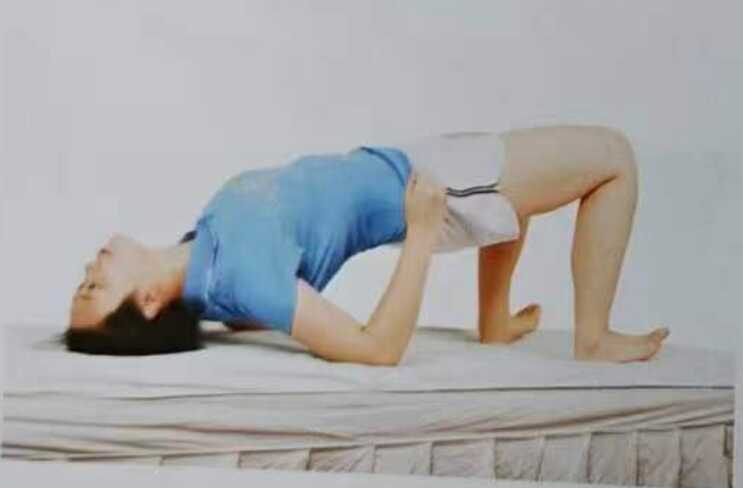 仰卧位,用头部以及双肘部、双足跟撑起腰臀部,背部腾空后伸,定住 5 秒后身体缓慢平卧,循环做10~ 15 次。