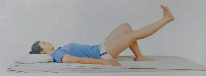 仰卧位,一腿屈曲或放松,患腿抬高 30°,膝盖绷直不打弯,脚踝尽力背伸,保持脚踝、膝盖、大腿成一直线,定住,待抬高的大腿有酸胀感后缓慢放下,两腿交替进行,重复进行10 ~ 20 次。