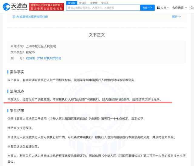 文书内容显示,法院认为,经穷尽财产调查措施,该案被执行人郑爽暂无财产可供执行,故无继续执行的条件,应终结执行程序。