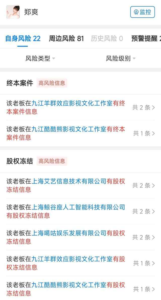天眼查App显示,目前郑爽名下共关联10家企业,5家为存续状态,包括上海鲸谷座人工智能科技有限公司、上海艾艺信息技术有限公司、上海噶咕娱乐发展有限公司、九江酷酷熊影视文化工作室、九江羊群效应影视文化工作室。其中,郑爽所持上海噶咕娱乐发展有限公司、上海鲸谷座人工智能科技有限公司股权已被冻结。