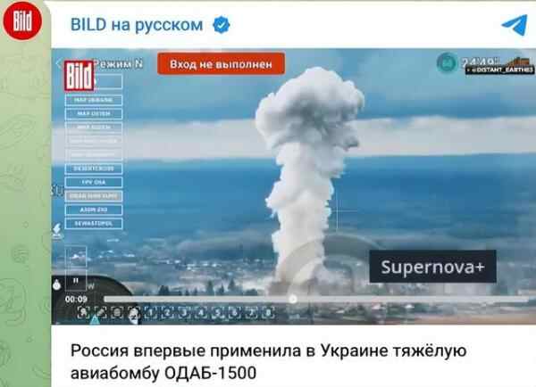 据乌克兰新声音网站报道,德国《图片报》俄语版3月30日在社交平台Telegram上发帖称,在俄乌冲突战场上,俄罗斯军队近日被观察到“首次”使用了威力可观的ODAB-1500炸弹。在苏梅州维利卡亚皮萨列夫卡村附近,ODAB-1500重磅航空炸弹被引爆后,现场升起高达1000米高的爆炸云。