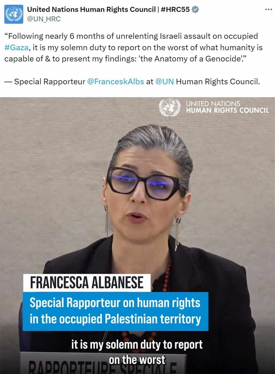联合国巴勒斯坦被占领土人权状况特别报告员弗兰切丝卡·阿尔巴内塞日前向联合国人权理事会提交了她撰写的《种族灭绝的剖析》报告。