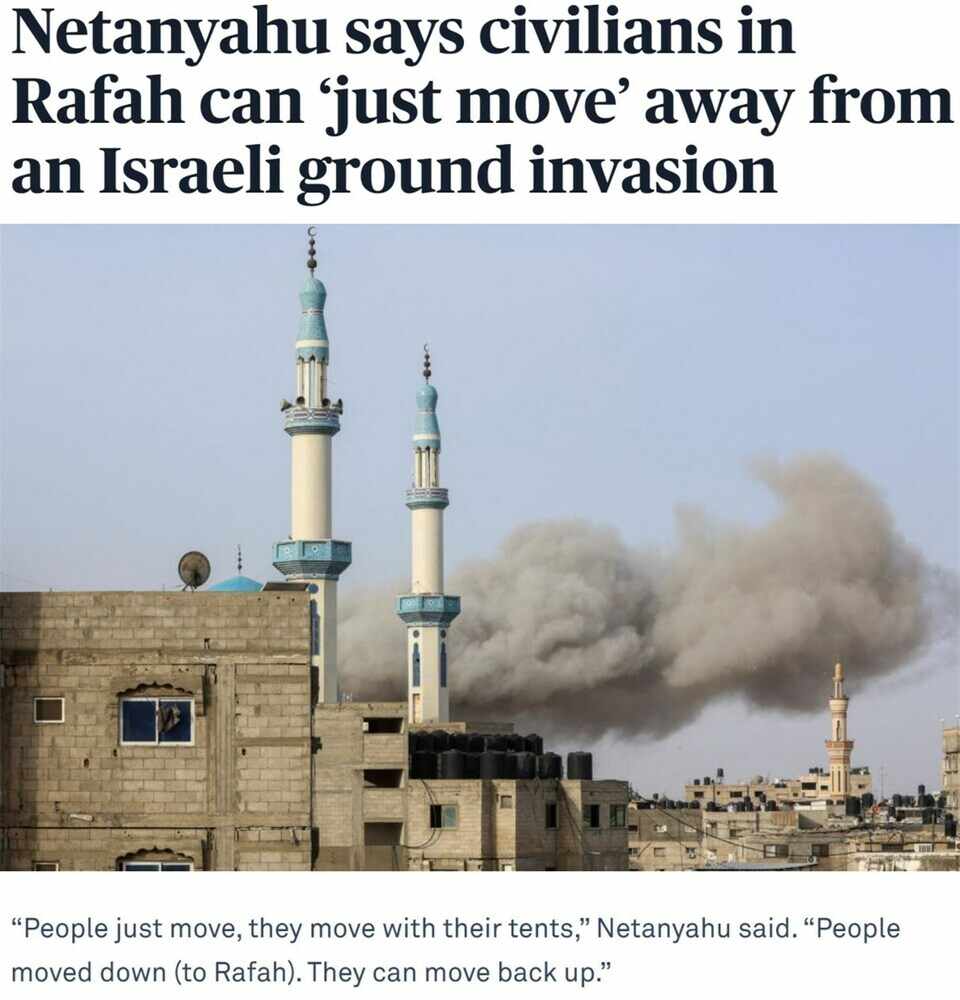 内塔尼亚胡还试图淡化美国对平民安危的担忧,称加沙地带仍有65%的区域是开放的,加沙人只要带着帐篷就能逃离战火。