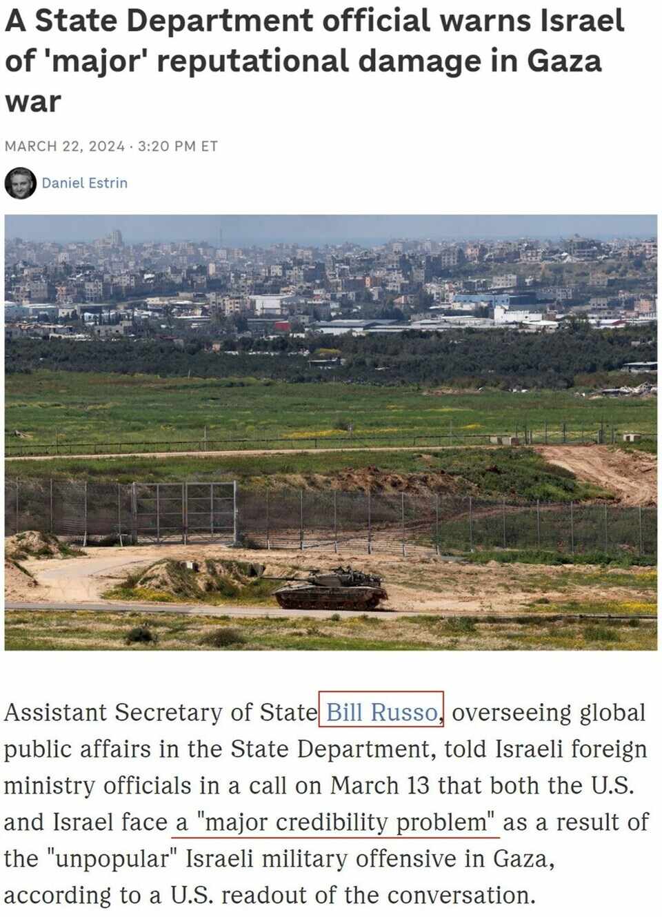 用拉索当时的话说,因为残酷的战争、巴勒斯坦平民惊人的死亡数字、加沙地带由人为造成的饥荒,以及全球对以色列坚持延长战争的日益不满,以色列以及作为其安全担保人和亲密盟友的美国都面临“重大声誉问题”。