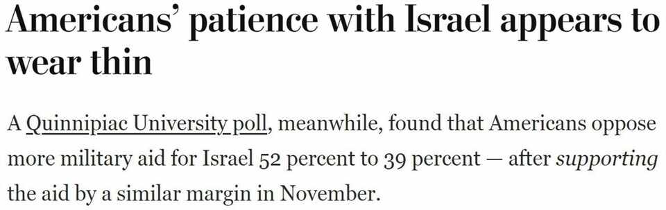 这是民调首次发现多数美国人不支持这场战争。与去年11月的调查结果相比,这堪称是一个重大转变,因为当时大多数美国人支持以色列的行动。