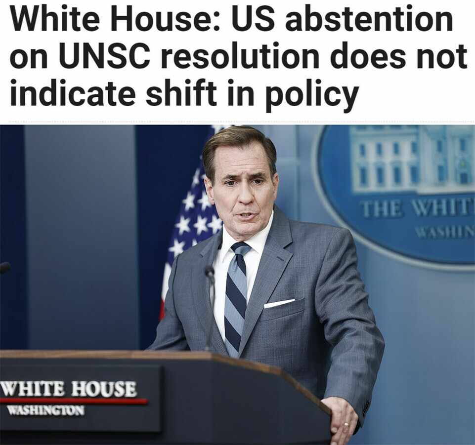 虽然拜登政府在最新的安理会投票中终于决定不再独家否决,改投了弃权票,但白宫国家安全委员会战略沟通协调员约翰·柯比在投票结束后第一时间向媒体表态:“我们的弃权并不代表政策的转变。”
