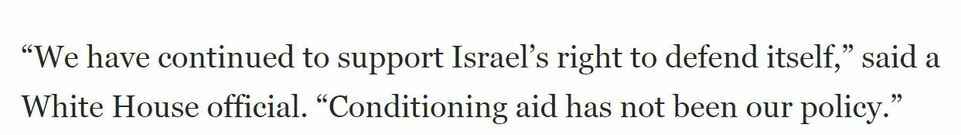一名白宫官员告诉《华盛顿邮报》:“我们始终支持以色列的自卫权。给对以援助设定附加条件从来都不符合我们的政策。”