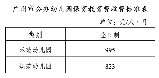 《通知》指出,公办全日制规范幼儿园保教费标准为823元/月,公办全日制示范幼儿园保教费标准为995元/月。公办寄宿制幼儿园保教费标准在全日制收费标准上上浮30%。